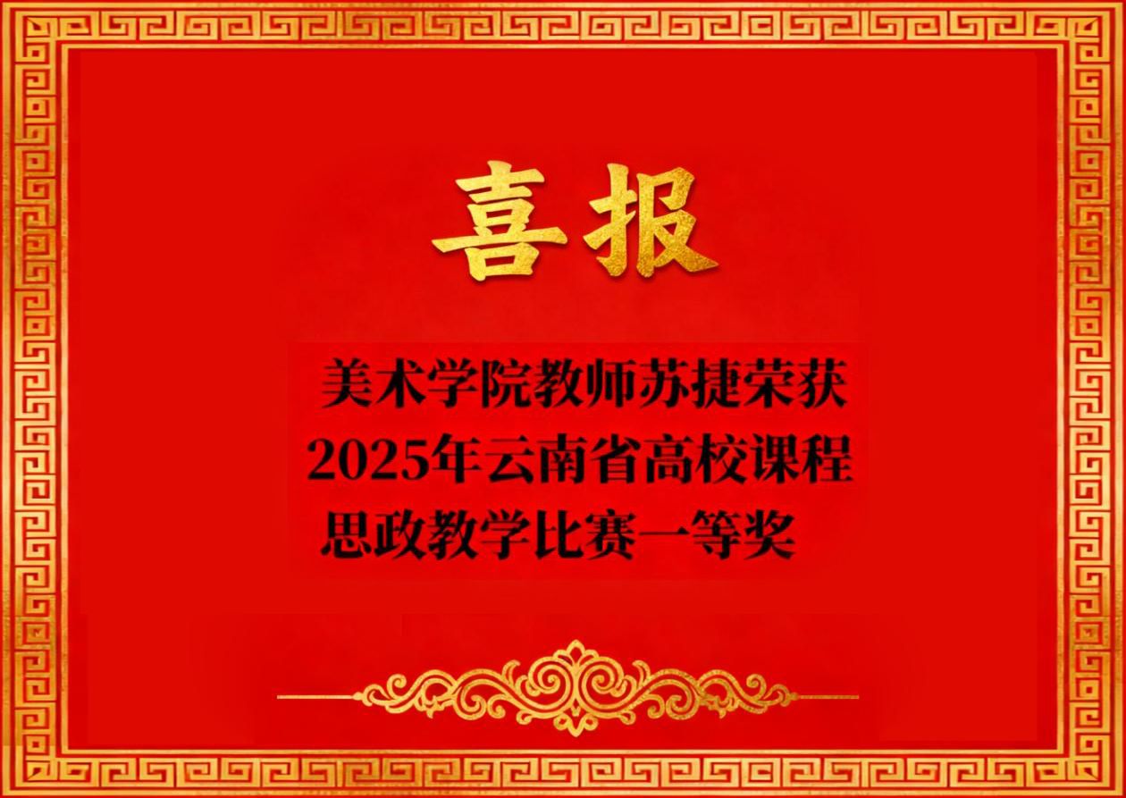 2025年10月30日,2025年云南省高校课程思政教学比赛结果正式揭晓。经过激烈角逐,美术学院教师苏捷凭借其出色的课程思政教学设计与精湛的现场讲授,在众多优秀选手中脱颖而出,荣获2025年云南省高校课程思政教学比赛一等奖!本次比赛由云南省高校课程思政教育联盟组织,分为新工科组、新文科组、新农科组、新医科组、职教基础课组、职教专业课组六个组别。比赛共收到全省各高校推荐的157个参赛案例,最终评选出特等奖12项、一等奖37项、...