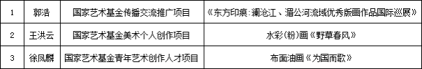 近日,国家艺术基金2026年度资助项目名单公布,美术学院3个项目获批立项。郭浩教授主持的《东方印痕:澜沧江、湄公河流域优秀版画作品国际巡展》项目获批国家艺术基金传播交流推广项目立项;王洪云副教授的水彩(粉)画《野草春风》获批国家艺术基金美术个人创作项目立项;油画系教师徐凤麟的油画《为国而歌》获批国家艺术基金青年艺术创作人才项目。