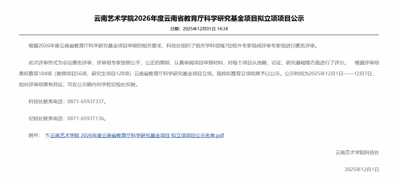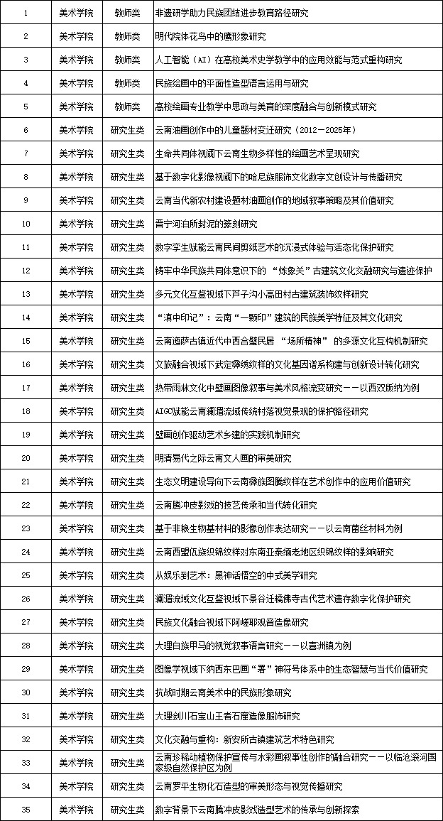 近日公布的2026年度云南省教育厅科学研究基金项目中,美术学院王昊英等5位教师及30名研究生同学获批2026年度云南省教育厅科学研究基金项目立项,立项数量创历史新高。