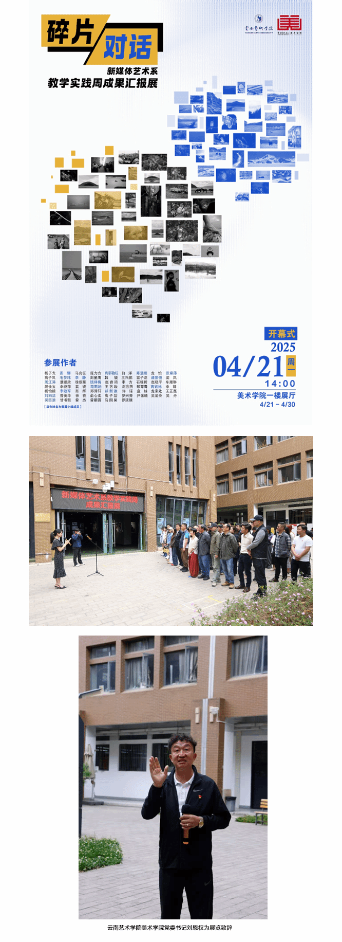2025年4月21日,由云南艺术学院美术学院新媒体艺术系师生倾力打造的 “碎片·对话——新媒体艺术系教学实践周成果汇报展”,在美术学院一楼展厅隆重启幕。美术学院党委书记刘恩权、副书记何君、美术学院副院长张炜、美术学院副院长沐晓熔莅临现场,与美术学院师生共同见证这一视觉盛宴的开启。