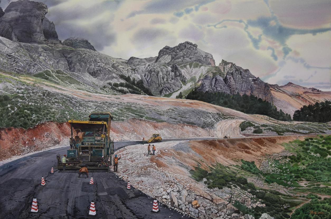《高原筑路人拓跋》 112cm×150cm 纸本水彩 王洪云 2024年