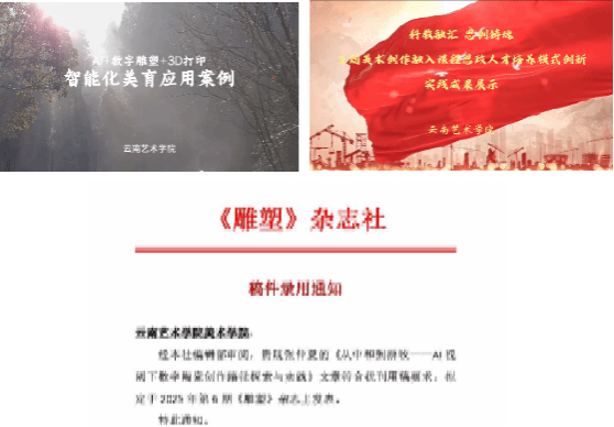 三、在创新人才培养方面,立足云南民族美术资源的开发与利用,积极探索数字化前沿与应用领域,持续增强创新应用研究与实践力度,积极建立行业企业合作发展平台,以聘任行业导师与产业导师+“双师双能型”教师培养及学生就业能力提升项目、政校企交流合作的形式,推动市场导向的产业融合,构建教创研用四位一体的人才培养模式。云南艺术学院美术学院党委书记刘恩权率雕塑专业师生赴建水开展访企拓岗与对外交流工作,进一步为提升产教融合与校企合作质量提出建设思路与改进举措。聘任“建水紫陶四老”为代表的国家级、省级非物质文化遗产代表性传承人、紫陶名家为美术学院雕塑专业行业导师、客座教授、产业导师,加强双师型队伍建设,以双师共建薪火相承非遗技艺,使学院成为连接传统技艺与当代创新发展的人才培养与创新基地。依托云南省高校数字化艺术创作重点实验室开设《“双师双能型”教师培养及学生就业技能提升项目》,加强“双师双能型”教师培养,培训教师7人、本科生14人、研究生4人,在美术学院公众号上连续发布8期《AI+数字造型+3D打印课程》学习报告,以在地性项目制、生态文明创作成果产出为导向的形式,提高师生人工智能与创新创业能力。2020级毕业生雕塑作品入选《2025届全国高校毕业生优秀雕塑作品展》7件,其中《布朗族系列》雕塑作品荣获铜奖。在校本科生立项省级大学生创新创业训练项目2项、荣获大学生创新校赛铜奖2项、入选国家级省级展览8项,在校研究生入选国家级省级展览52项。荣获优秀指导教师3项。教师雕塑作品入选国家级、省级、校级展览20项。开设微专业课程《AI雕塑设计》。申报教育部高等学校科学研究发展中心产学研创新基金项目《智绘陶·生成式AI赋能陶瓷创新人才培养模式探索与实践》。