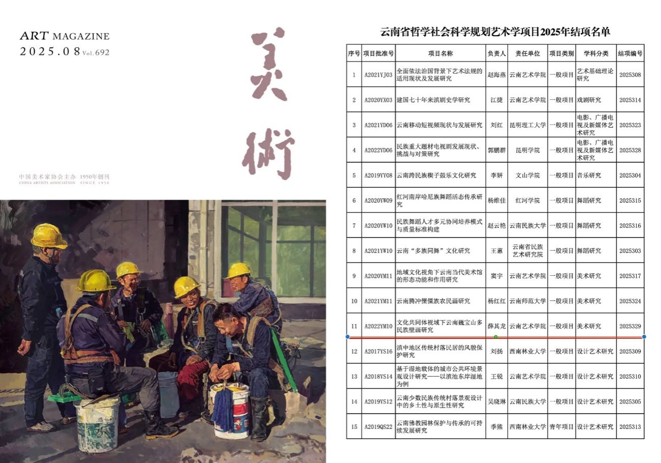 在课程建设方面紧扣行业发展趋势与学科前沿,强化AI赋能与校企合作,在U课AI平台建成知识图谱1门,新开AI课程1门。强化教研与云南面向南亚东南亚的战略定位,推动课程体系与前沿研究、专业知识与行业应用深度融合,在建美术学国家级一流专业建设项目1项,主持及参与各级科研项目8项;完成云南省哲学社会科学规划艺术学项目“文化共同体视域下云南巍宝山多民族壁画研究”结项1项;1部高质量图像学著作在人民美术出版社重印;获人民美术出版社资助出版在研著作1部;在《美术》(CSSCI)、《中国宗教》(C扩、北核)、《International Journal of Mental Health Nursing》(SSCI)、《中国美术》(AMI扩展期刊)等学术期刊发表学术论文5篇;获第五届全国高校教师教学创新大赛云南艺术学院校赛特等奖1次。云南省大学生创新创业训练计划国家级项目结项1项,在研1项;指导研究生获得云南省教育厅科研基金研究生项目7项;推进师生共研举措,与13位学生进行师生共研科研项目2项。