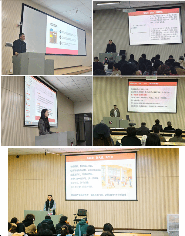 活动现场氛围浓厚,各年级辅导员紧扣育人初心,结合美术专业特色,有序推进各项教育内容。首先,年级辅导员引导同学们立足美术专业所长,将笔墨丹青融入社会主义精神文明建设,以艺术之力传递时代声音、彰显青年担当。随后,辅导员结合高校校园安全工作重点,对同学们在校期间的人身安全、财产安全、消防安全、网络安全及心理健康等事宜逐一细致叮嘱、耐心提醒。最后,年级辅导员以“新学期、新大楼、新气象”为主题,勉励同学们立足崭新学习环境,深耕专业技艺、坚守艺术初心,在新征程上展现新风貌、收获新成就、开启新华章。同时,辅导员们也详细告知了同学们日常建议与困难的反馈渠道,畅通师生沟通桥梁,切实做到“有诉求有回应、有困难有帮扶”,让每一位美院学子都能在温暖的育人氛围中安心求学、逐梦成长。