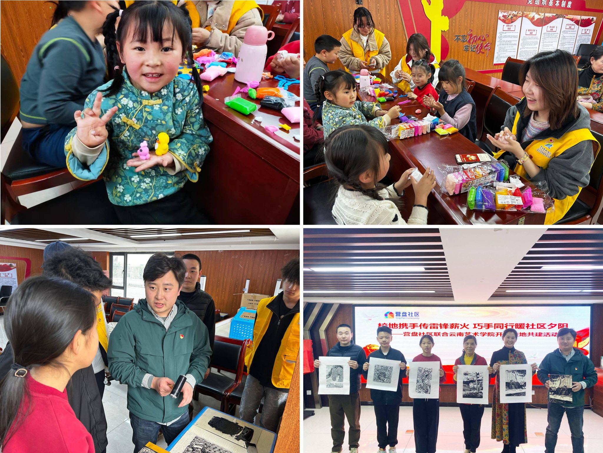 超轻粘土创作时,孩子们揉、捏、搓、压,将黏土塑成呆萌小动物、精致小摆件,将生活巧思与志愿者的创意灵感相互交融;版画印制体验由美院版画专业教师指导,居民挑选风景、马年主题等木刻版画拓印,沉浸式领略传统版画的独特韵味。