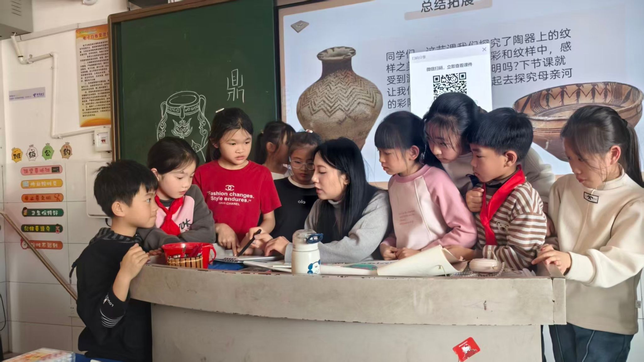 派驻学生华雪媄在富宁第三小学课后为学生讲解陶器上的纹样