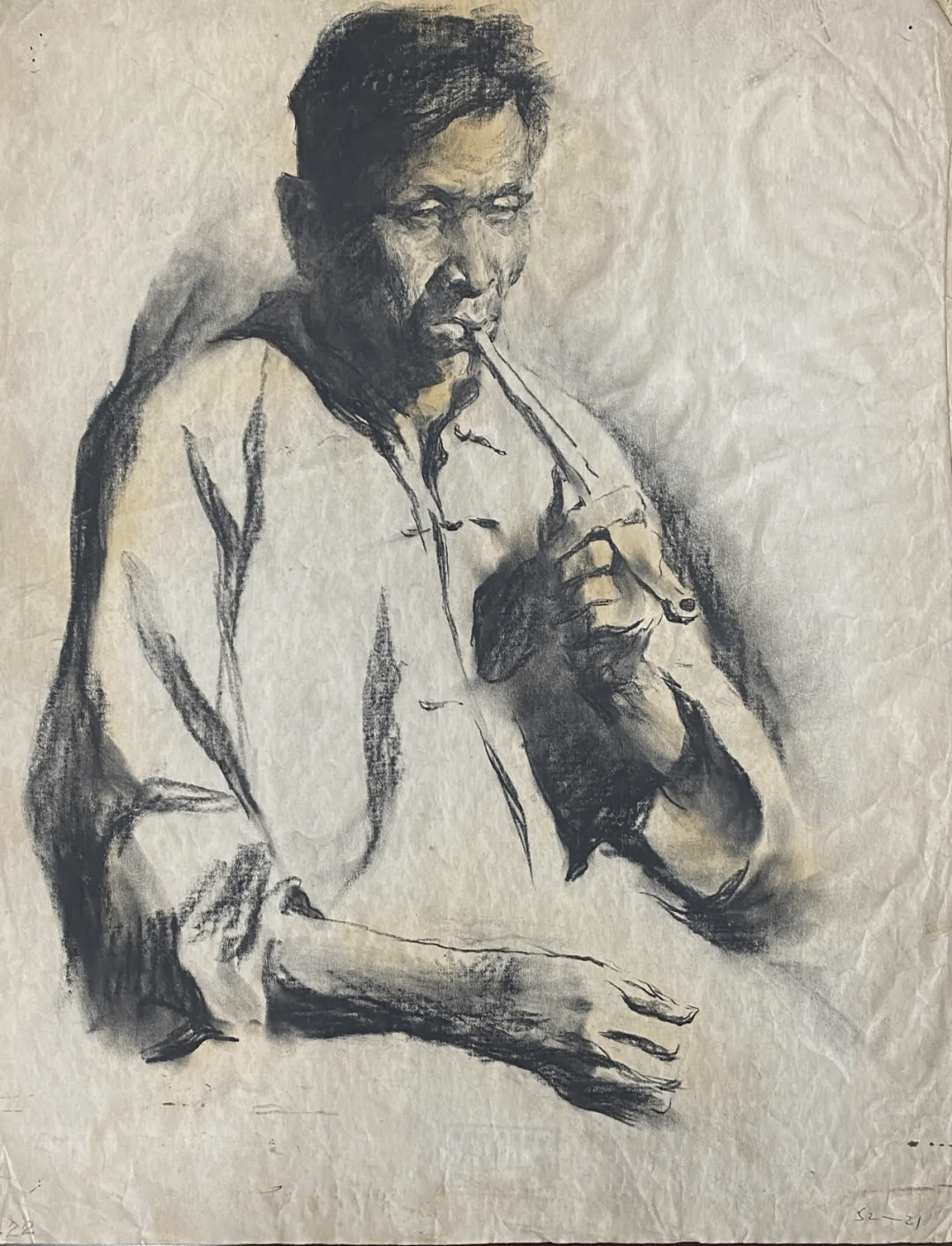 焦小健-《抽水烟的中年人》-56×44cm-纸本素描-1979年