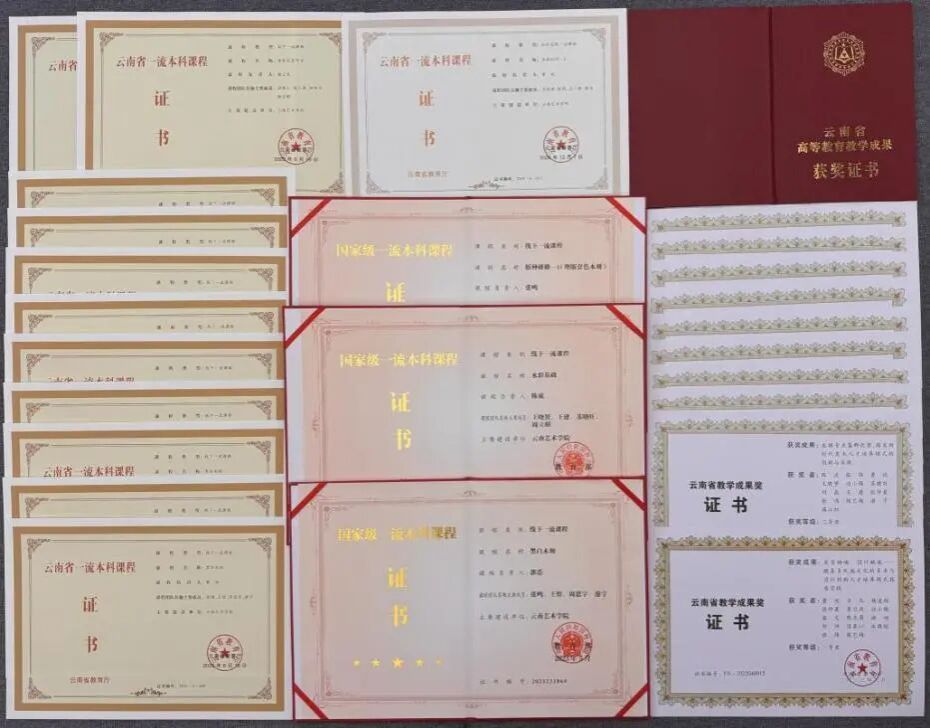 “十四五”期间,学院实现了一流专业全覆盖(4个国家级一流专业、1个省级一流专业),并紧密结合“增A去D”建设方案,统筹专业建设“增B提C”布局。2024年10月高质量完成了本科教育教学审核评估工作。持续推动教育教学高质量发展,获批国家级一流本科课程3门,省级一流课程9门,省级思政示范课程1门,云南省“拓金计划”示范课3门,国际课程(上线)1门,积极推进3门知识图谱和1门AI课程建设,出版特色教材2部。在“全国普通高等学校美术教育专业本科学生和教师基本功展示评选”大赛中,教师获得个人全能一等奖1次、个人全能三等奖3次,实践组专业能力展示单项奖2次:学生获得个人全能二等奖1次,三等奖1次,专业技能单项奖2次。