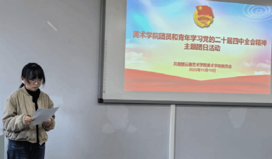 为深入学习贯彻党的二十届四中全会精神,牢牢把握新时代青年工作的使命任务,持续强化青年思想引领与价值塑造,2025年11月10日,共青团云南艺术学院美术学院委员会于公教楼A405教室,开展了团员青年学习党的二十届四中全会精神主题团日活动。会议由美术学院团委书记徐中宏主持。