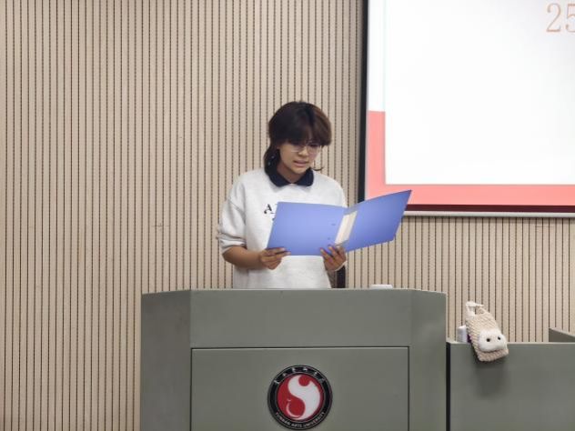 李小雅代表学生会主席团发言,希望学生会全体成员要聚焦政治引领,坚持不懈用党的创新理论凝心铸魂,作为新时代的新青年应当牢记神圣使命,履行庄严承诺,继承发扬我院学生会组织的优良传统,在新的征程上不懈奋斗,砥砺前行,团结同学、服务同学、联系同学,发挥好桥梁纽带作用。经过大家团结协作,已取得良好成效,今后要再接再厉,为美术学院团学工作迈向新台阶贡献青春力量。